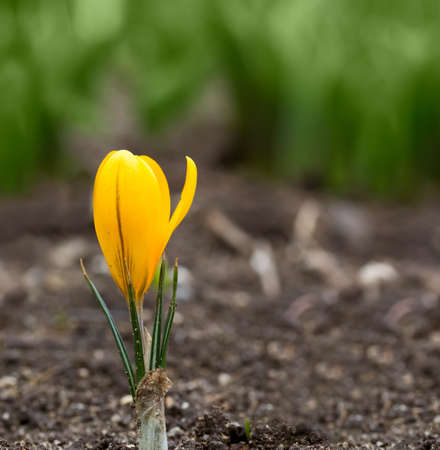Selective focus. Yellow crocus growing outside. View at magic blooming spring flowers crocus sativus. Macro photography