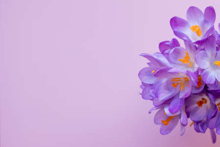 Purple crocuses close-up outdoor with copy space.