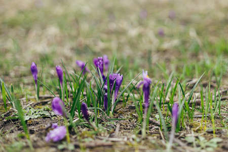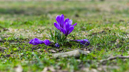 Close up of flowering purple crocus in spring garden - elective focus, copy space