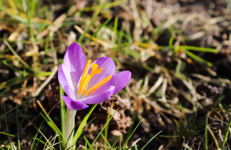 Purple Crocus flower. View of single blooming spring flower in wildlife