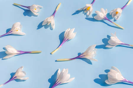 White crocusses on blue background, early spring