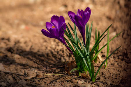 beautiful purple crocuses in the sun in early spring