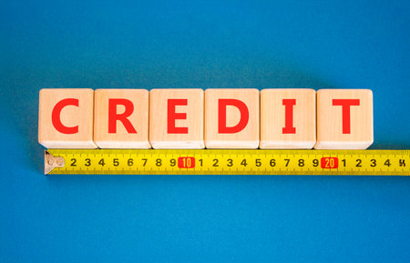 Credit symbol. Concept word Credit on beautiful wooden blocks. Beautiful blue background. Beautiful yellow tape measure ruler. Business credit concept. Copy space.
