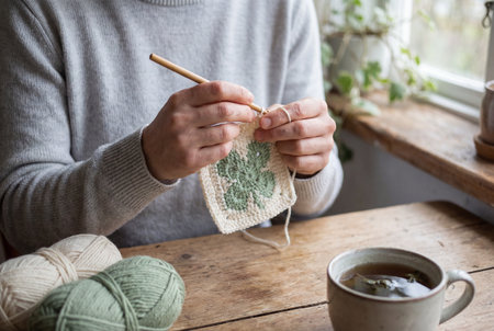 A person in a grey sweater sits at a rustic table near a window using a wooden hook to crochet a green shamrock pattern into a white square next to a mug of herbal tea.