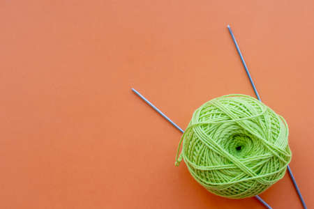 Green knitting yarn ball and knitting needles top view on an orange background with copy space. Eco-friendly knitting, hobbies, relaxation