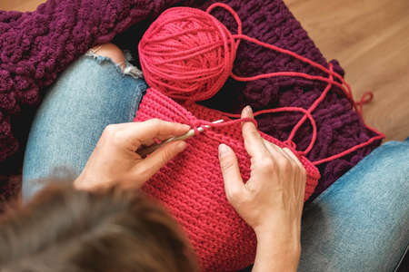 female hands close-up, crocheting clothes on the sofa at home, handmade