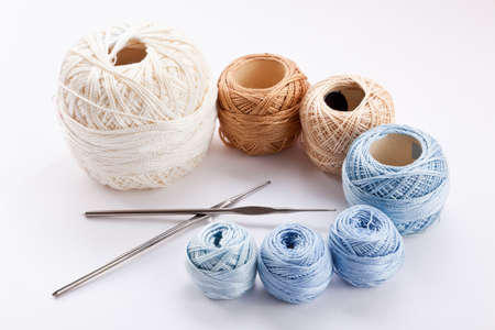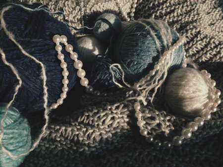 Cuts of yarn and thread on the background of a knitted product. Beige and blue colors of woolen and acrylic threads. Pearl beads are lying on balls. Still life.