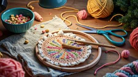 Colorful woven yarn art with tools on wooden table. That the image is generated using AI.