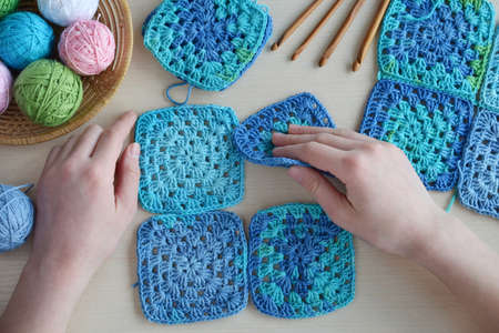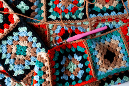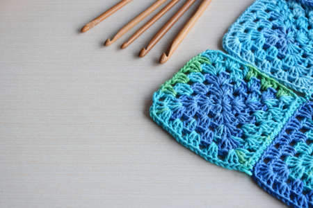 Flat lay with knitting yarn balls and crochet hooks on grey backgroundGranny squares crocheting in process. Colorful Afghan squares pattern close up photo