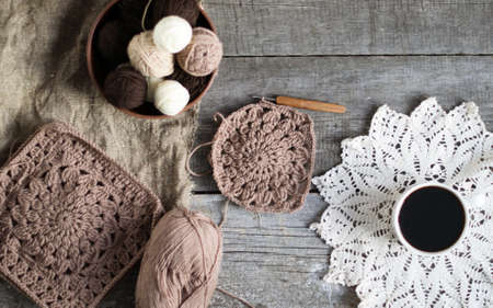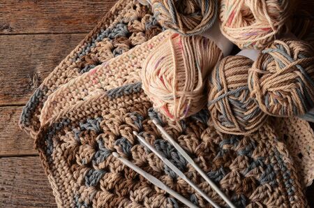 Crochet process from soft woolen yarn of brown color. Woolen yarn on a wooden background.