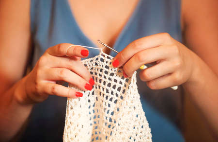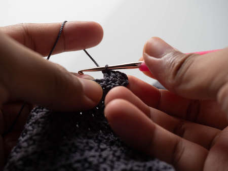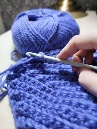 Close-up of young female hands of a Caucasian girl doing crochet, shows how to knit correctly. Shallow depth of field. high dynamic range.