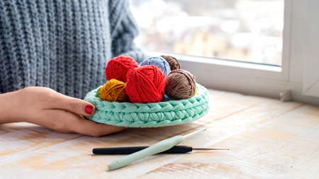 Girl holds multicolored threads for knitting with a hook and a hook