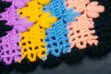 Crochet piece made of wool and knitted by hand with crochet hook and woolen buds