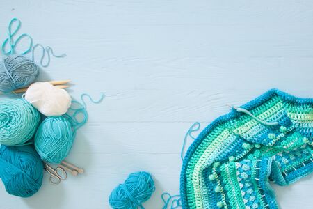 Yarn in cold colors and knitting accessories. Female hobby concept.