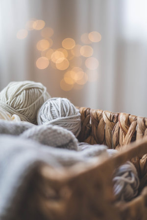 Cozy homely atmosphere. Female hobby knitting. Yarn in grey colors in a basket