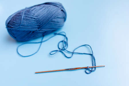 Blue ball of knitting threads with yellow crochet for knitting warm clothes