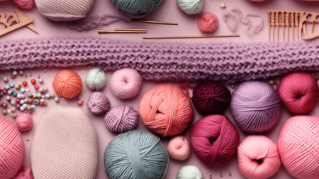 a knitted wool sweater in progress, surrounded by knitting needles, yarn balls, and other knitting accessories. the seamless pattern of the sweater fabric. This photo can appeal to knitting enthusiasts and crafters. SEAMLESS PATTERN. SEAMLESS WALLPAPER