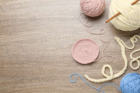 Flat lay composition with knitting threads and crochet hook on wooden table, space for text