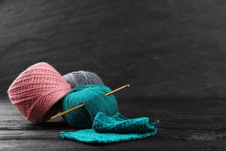 skeins of colored yarn and knitting on a dark wooden background needlework on a background of self-isolation knitting concept
