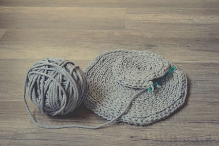 Home hobby. Skeins of woolen threads, yarn, knitted product on the floor. Top view