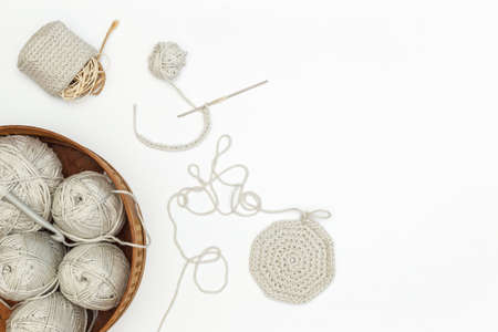 Skeins of gray cotton yarn in a wicker basket and accessories made from these threads. On a light background, with space, top view