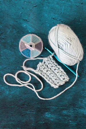 Top view photo of soft wool yarn, crochet hook and plastic box with blue seed beads. Handicraft and hobby concept.