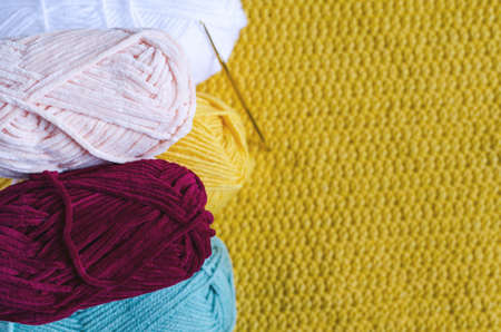 Crocheted motives and balls on yellow background.
