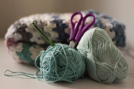 blue wool balls with hook and scissors