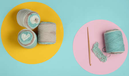 Yarn with skeins of woolen threads and a wooden crochet for knitting on a blue-pink pastel background. Top view