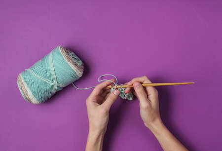 Women's hands knit yarn with wooden crochet and woolen threads on purple background. Housewife hobby
