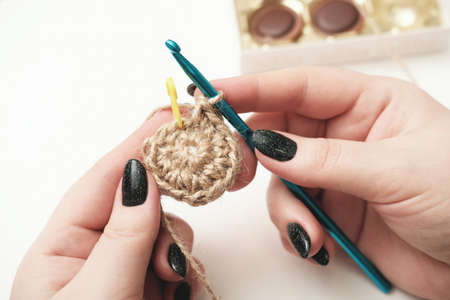 hands of a woman holding crochet and jute thread and fragment of a knitted pattern. natural eco knitting, hand made cup coaster. craft and hobby, eco home decor