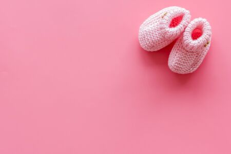 knitted baby booties on pastel pink background - Image