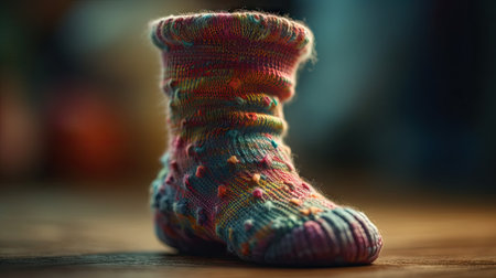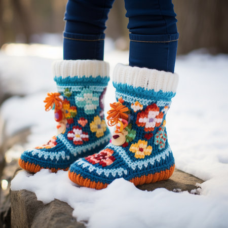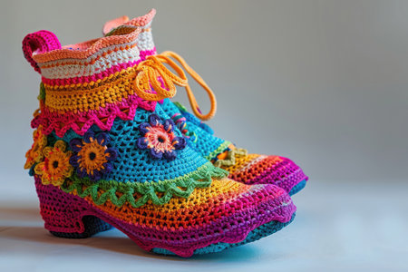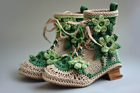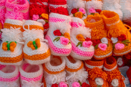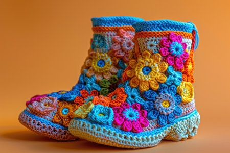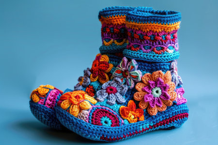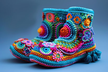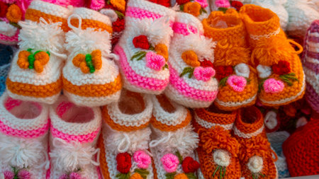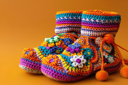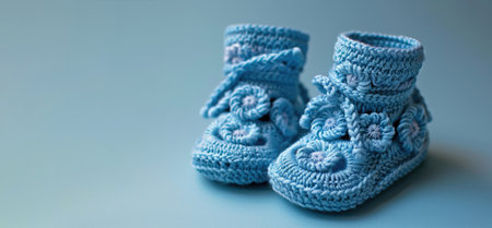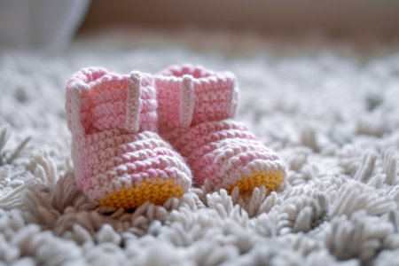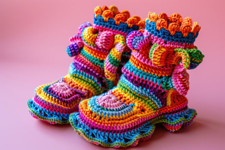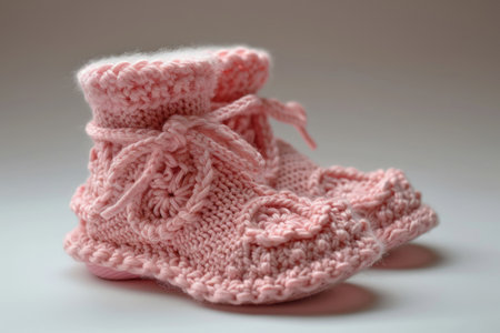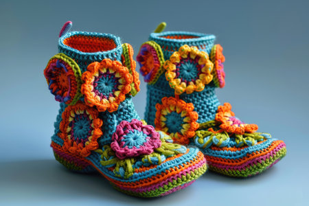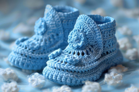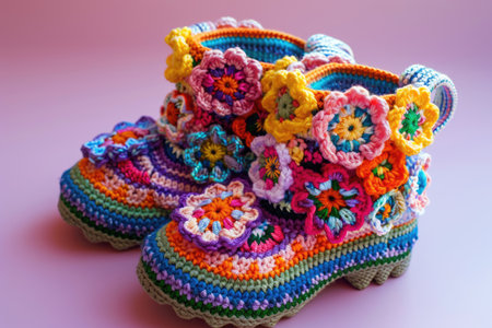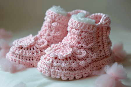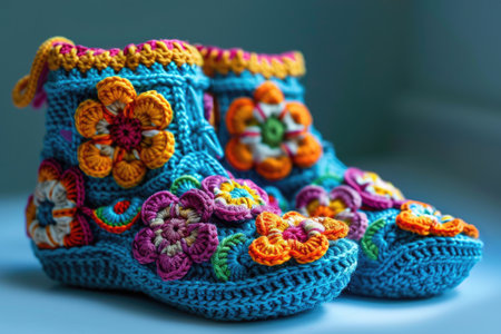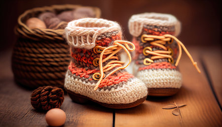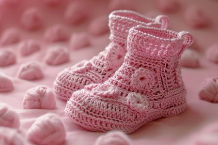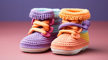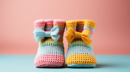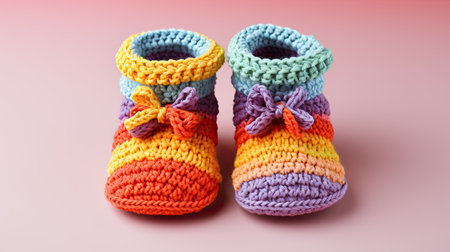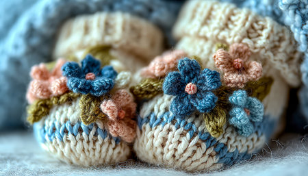 Knitted baby booties in pastel colors with a soft floral background Clear details and vibrant colors enhance ...