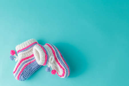 Newborn announcement. knitted baby booties on plain blue background