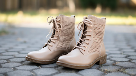 A pair of boots and a scarf neatly arranged on a soft, neutral-colored surface, leaving room for promotional content.
