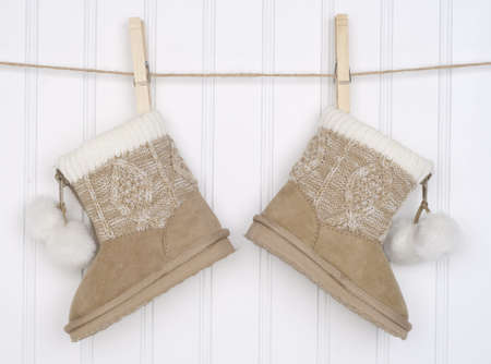 Pair of Winter Boots Hanging from a Clothesline.
