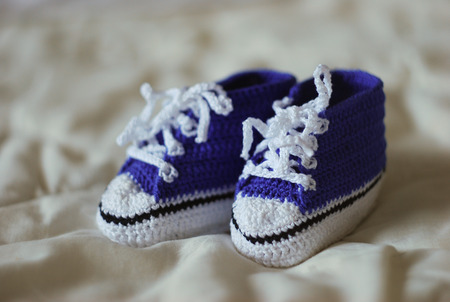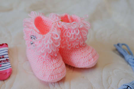 Knitted boots. Knitted shoes. Booties for babies. Made by hands. Crochet