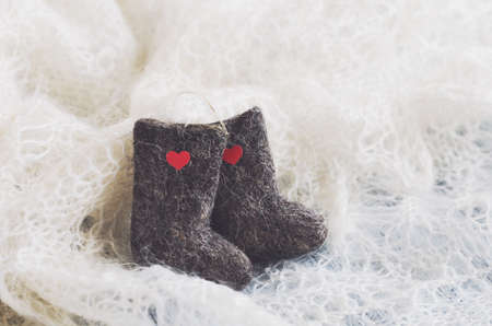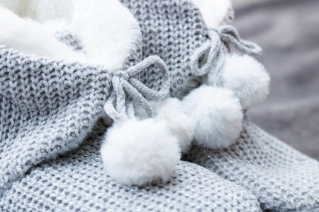 A pair of gray booties for a small child. Early morning, light from the window.