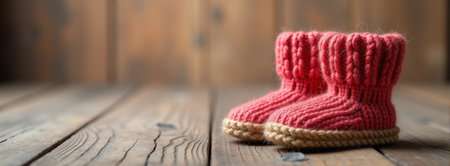 winter knitted booties ang yarn on wooden background, winter or autumn background with Generative AI Technology