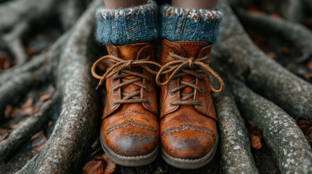 Autumnal flatlay featuring brown leather boots, a beige knitted sweater, and autumnal decor on a wooden floor. Cozy and warm atmosphere.