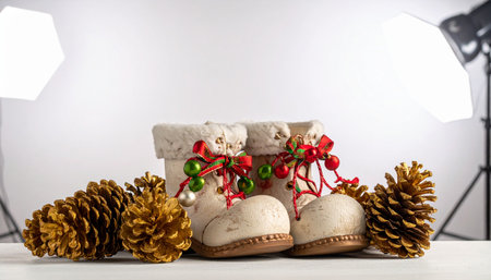 Christmas still life with boots, pine cones and decorations on a white background