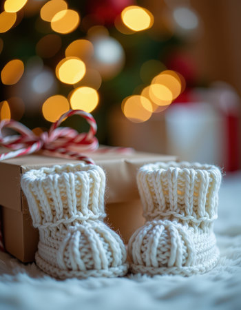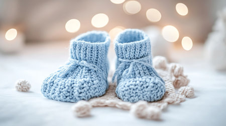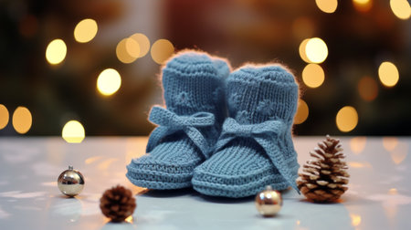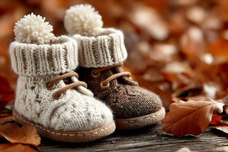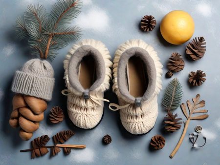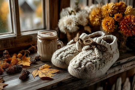 Knitted baby shoes on soft blanket, dried flowers, warm cozy mood.