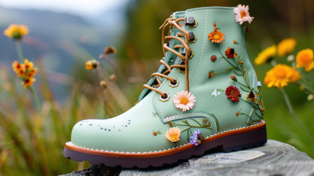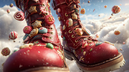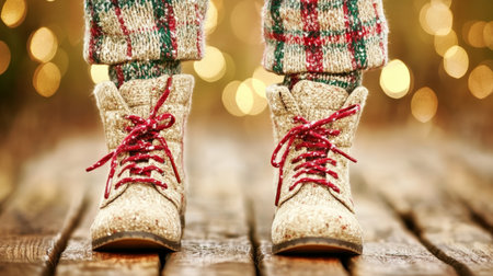 A pair of stylish red boots with a floral pattern sets the scene amidst glowing Christmas ornaments, creating a warm and festive holiday atmosphere.