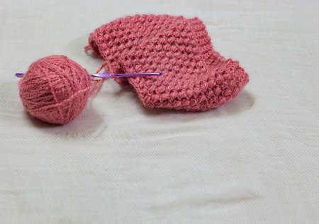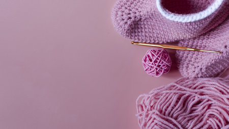 skein of pink yarn with crochet and knitted shoes on a colored background needlework on the background of self-isolation knitting concept