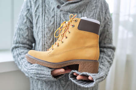 New womens leather brown waterproof hiking winter autumn boots in hands of female