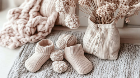This serene image features cozy knitted baby booties paired with soft textiles and dried flowers, creating a warm and inviting atmosphere for infant photography or home decor.