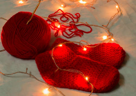 Handmade red color woolen christmas socks, chrochet needle and wool ball illuminated with miniature christmas lights. copy space background. winter fashion. close up.