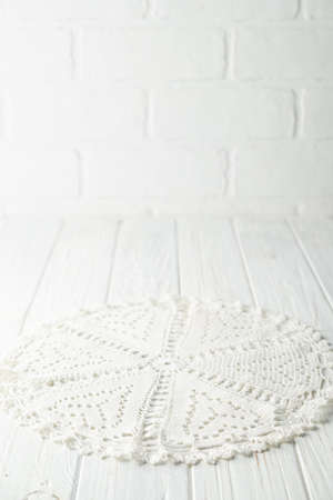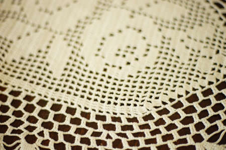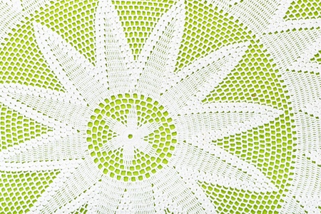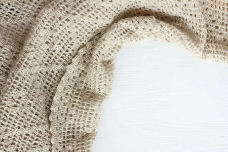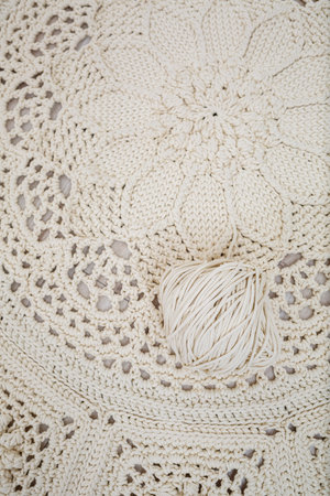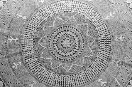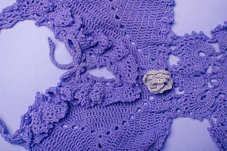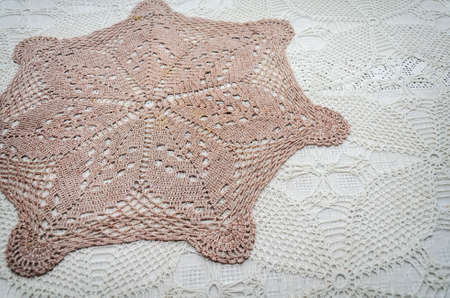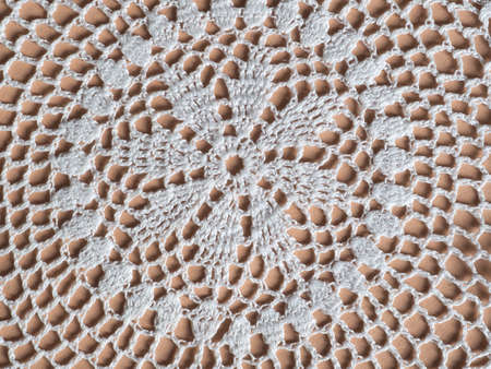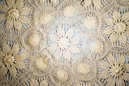 Beautiful knitted pattern close-up. Lace knitted fabric made of white thread. Handmade items. The texture is knitted from threads.