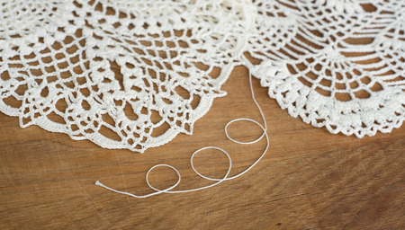 A closeup shot of textile cotton yarn, needle, and filet crochet on a wooden surface