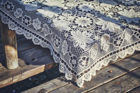 This image features a close-up view of delicate lace fabric showcasing intricate patterns and textures. The soft, warm light enhances its romantic and vintage appeal.